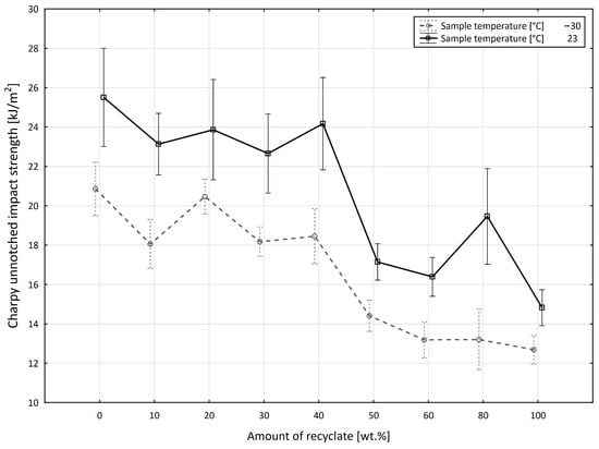 Figure 8 shows the effect of the addition of recycled material on the unnotched impact strength measured in specimens exposed to a temperature of −30 °C. The value of the unnotched impact strength up to 40 wt.% recycled material decreased from at least 23.3 kJ/m2 in virgin material to 20.7 kJ/m2, a reduction of 11.2%. At the recyclate concentration of 50 wt.%, it dropped to the value of 14.1 kJ/m2, a reduction of 39.5%. With the further addition of recyclate, it dropped only marginally, to a final value of 11.7 kJ/m2, which represented an overall reduction of 49.8% compared to the virgin material.