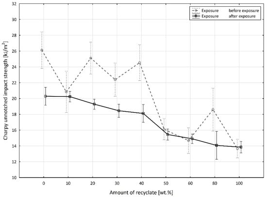After the specimens were exposed to elevated temperature, they exhibited lower values of unnotched impact strength up to the recycled material concentration of 40 wt.% compared to the specimens before exposure, ranging from 11.9 to 21.3%. At a recyclate concentration of 50 wt.% or more, the unnotched impact strength of the specimens after exposure was slightly greater than it was before exposure. The results also confirm the conclusions of Khalili et al. [25] and Milosevic [26].
