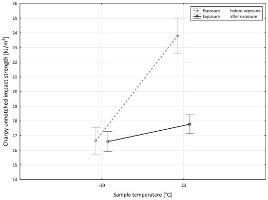 Furthermore, Figure 13 shows that at the specimen temperature of +23 °C the value of the unnotched impact strength before exposure (23.802 ± 1.195 kJ·m−2) was significantly higher than the value of the unnotched impact strength after exposure (17.771 ± 0.644 kJ·m−2). This difference was also significant (p = 0.000) at the selected level of significance of p = 0.05.