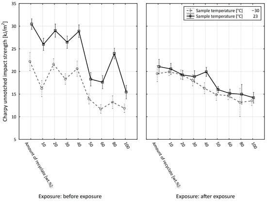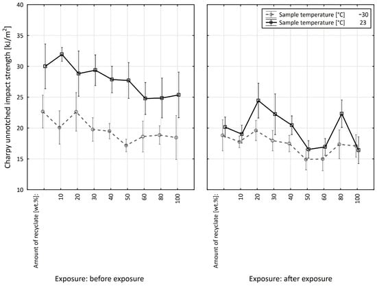 When examining the mutual interaction of the specimen temperature and exposure (Figure 12), without considering the effect of the recycled material amount, we can see that at the specimen temperature of −30 °C there was no significant difference in the difference between the studied value of the unnotched impact strength, acU (0.045 ± 0.799 kJ·m−2, p = 0.878).