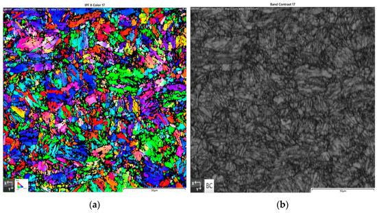 Microstructure of S960MC (EBSD): (a) IPF X, (b) band contrast.