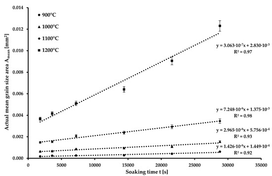 Based on the obtained data, a graphical dependence (Figure 3) was constructed between the mean area of the austenitic grain and the soaking time for each of the temperatures. The mean area (Amean) was determined as the square of the mean austenitic grain size (D). A linear curve was interpolated for each temperature, from which the value of the KT coefficient and the value of the mean grain size for the soaking time t = 0 s were determined (D0). The values of KT and D0 are given in Table 4.