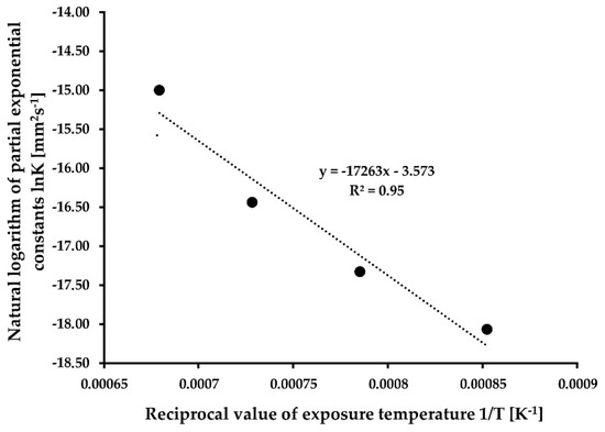 By multiplying the logarithms of both sides of this equation, it can be argued that the logarithm of should vary directly as the reciprocal of the absolute temperature (1/T). Therefore, the value of is equal to the given task of the slope of a grain-growth isotherm (KT). Figure 4 shows the natural logarithm of the slopes (KT) of the four lines from Figure 3 plotted as functions of the reciprocal of the absolute temperature (1/T) [18,22].