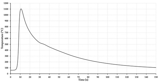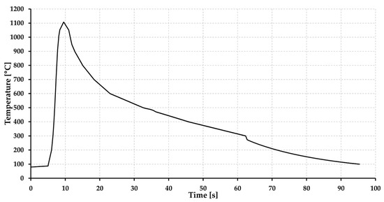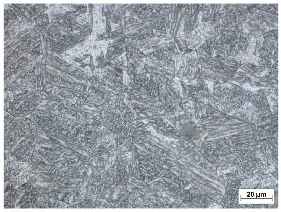 The welding thermal cycle was recorded by NiCr–NiAl-type K thermocouple located in the HAZ (TC1), which was placed on the root side of the weld at a distance of 0.96 mm from the root of the weld. The thermocouple was placed in the area where the material was exposed to temperature Tmax = 1104 °C. The heating rate was determined to be 205 °C·s−1, and the cooling time t8/5 was 17.5 s (Figure 6). The mean grain size for a given area was determined using the linear intercept method, using the microstructure image obtained by light optical microscopy (LOM) from the center of the sample thickness using ZEISS LSM 700 device (Carl Zeiss AG, Oberkochen, Germany).