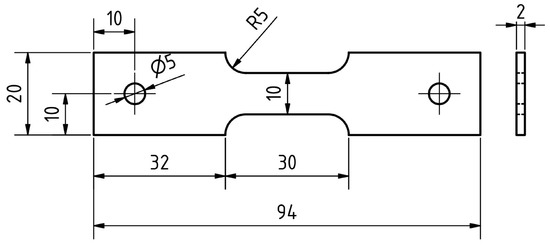 The welding procedure can be also substituted with physical simulation to achieve a comparable microstructure. For this purpose, the Gleeble 3500 device was used. The dimensions of the sample used are shown in Figure 7. A NiCr–NiAl-type K thermocouple was welded onto the sample in the middle of its length. The maximum temperature Tmax = 1105 °C and the heating rate was determined to be 210 °C·s−1 and time t8/5 was set at 17 s based on Figure 8. The mean grain size for a given area was also determined using the linear intercept method using a microstructure image obtained from the center of the sample by LOM using ZEISS LSM 700 device.