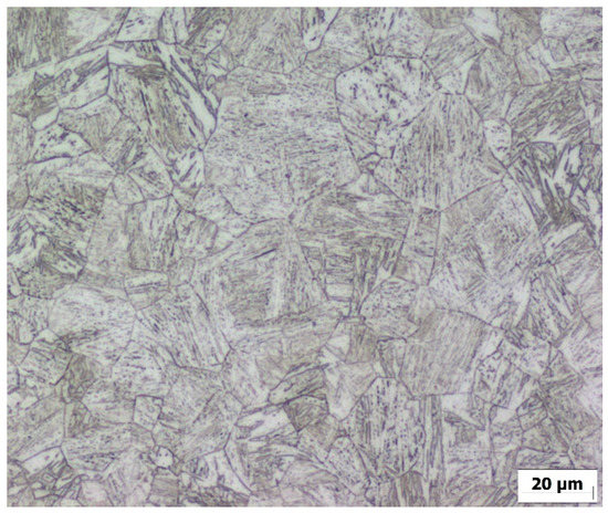 After the physical simulation, the microstructure image was also obtained from the sample’s center of the material thickness (Figure 10). The mean grain size was determined by the linear intercept method, the value of which was determined to be Dsim. = 19.4 µm. The difference between the calculated value of the grain size and the grain size of the simulated sample is 12%.