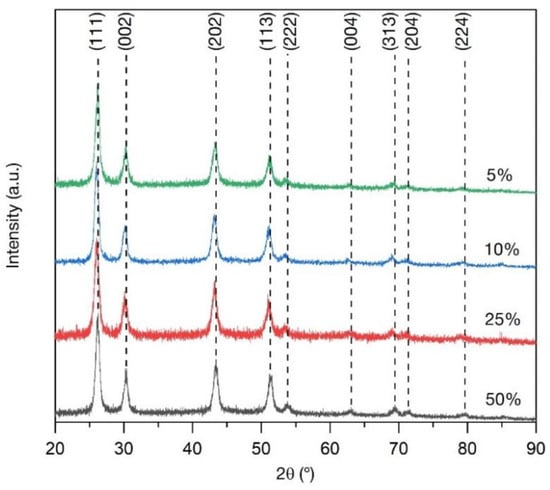 The profile analysis was carried out using the Jana2006 program package (version 25/10/2015) [47]. In our previous work [16], it was stated that all synthesized samples crystallized in the single cubic space group Fm-3m (225) (JCPDS card no. 24-0098 [48]). The XRD patterns are shown in Figure 1.