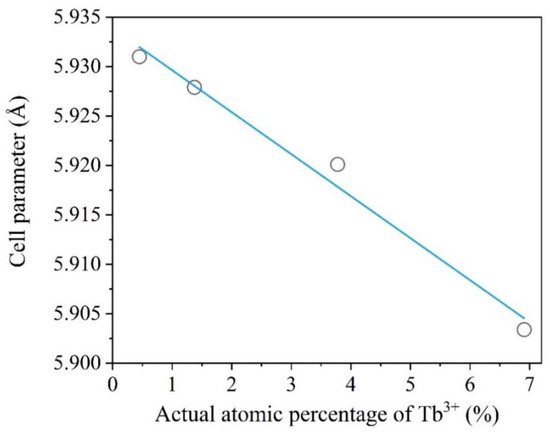 Correlation between the actual percentage of doping Tb3+ ions and the refined lattice parameter.