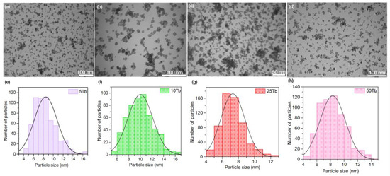 TEM images of (a) 5Tb MW, (b) 10Tb MW, (c) 25Tb MW, and (d) 50Tb MW; Particle size distribution of (e) 5Tb MW, (f) 10Tb MW, (g) 25Tb MW, and (h) 50Tb MW according to the TEM analysis.