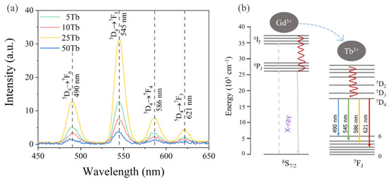 (a) X-ray-excited (U = 35 kV, I = 1.6 mA) optical luminescence spectra measured for x% of Tb3+; (b) schematic energy-level diagram showing the processes occurring in BaGdF5:Tb3+.