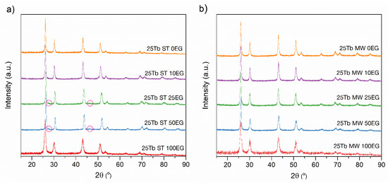 The XRD patterns of all MW and ST samples are presented in Figure 5. It can be seen that for solvothermal synthesis in a system containing only ethylene glycol (25Tb ST 100EG) as a solvent, the rate of crystal nucleation was low due to the high viscosity and slow diffusion of the reagents. The system had enough time to heat up before the formation of the crystals started, thus the pure BaGdF5 phase was formed.