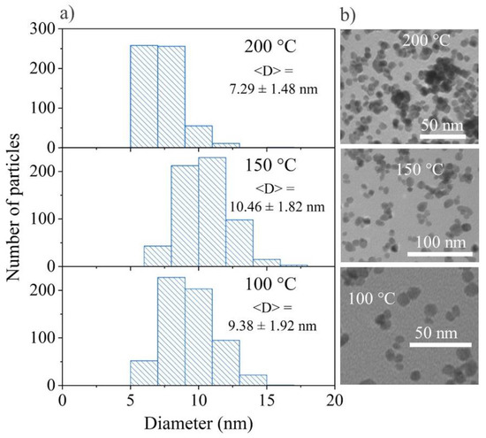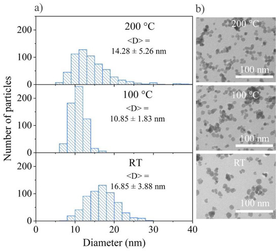 As evident from the particle size distribution, the samples synthesized at room temperature (RT) had an average size of 16–18 nm, at 100 °C it was 10–12 nm, and at 200 °C it was 11–13 nm (Figure 8).