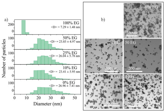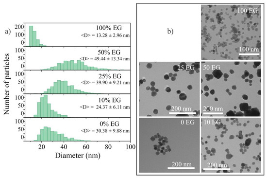 (a) Particle size distribution and <D> with the mean size ± standard deviation; (b) TEM images of 25Tb ST with different contents of EG 0, 10, 25, and 50%.