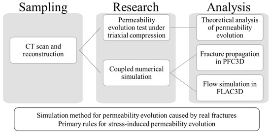Previous simulations were not able to duplicate the permeability evolution based on the fracture evolution at the microscale. This paper presents a coupling between a particle-based approach, which considers the micromechanical damage evolution under loading, and a continuum-based approach to simulate the gas flow. The coupled simulation approach comprises the following steps: (1) CT based analysis of the microstructure; (2) set-up of a particle-based micromechanical model (numerical twin); (3) application of mechanical loading on the particle-based model and observation of damage evolution; (4) set-up of equivalent continuum-based model; (5) transfer of damage pattern from the particle-based model to the continuum-based model; (6) simulation of gas flow in the continuum-based model. The research flowchart is shown in Figure 1.