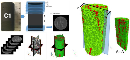 Five particle-based numerical twins with inclusions (C1, C2, C3, C4 and C5) are generated based on the CT analysis results of coal samples. The generation process to duplicate a numerical model based on the real sample C1 is illustrated in Figure 2 [21]. The components (coal matrix and inclusions) of other models are shown in Table 1 and Figure 3. Particle size was chosen in such a way that the diameter corresponds to the smallest thickness of the inclusions.