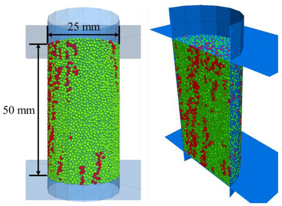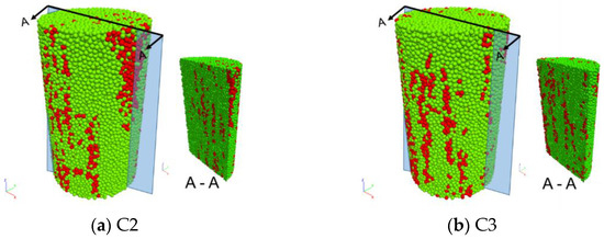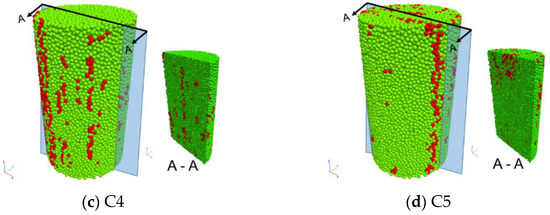 The inclusions, represented by red particles, have higher strength than the coal matrix. The inclusions in C1 (shown in Figure 3) are distributed mainly parallel to the axis of the sample. On the contrary, the inclusions in C4 (shown in Figure 3c) are located isolated near the side surface, and the inclusions in C5 are gathered at the top end (shown in Figure 3d). Corresponding numerical twins are generated as a documented example in Figure 4.