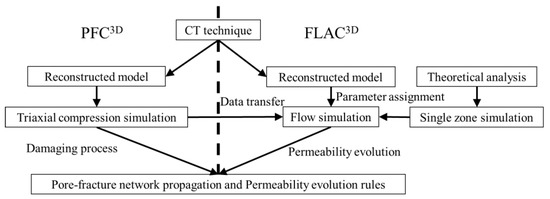 The overall permeability calculated by total flow rate and entire cross-section area of the sample is much lower than the permeability of the fractured region. Therefore, the consideration of the evolution of pronounced flow channels is important to get a detailed understanding of the fluid-mechanical coupled behavior of coal, especially if inclusions are present. The combination of continuum- and discontinuum-based numerical simulation methods is a promising way to get information about that process at the microscale. Figure 6 illustrates a specific coupling scheme between the discontinuum code PFC3D [22] and the continuum code FLAC3D [20]. This method is developed to investigate the fluid-mechanical damage evolution of coal samples with inclusions under triaxial compression.