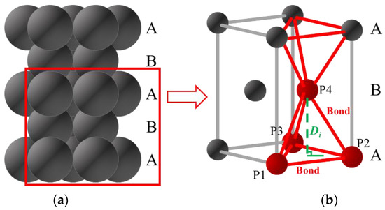 Hexagonal close-packed structure. (a) stack of particles in PFC3D (b) simplified particle-bond model.