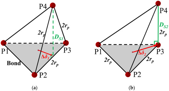 The particles are in hexagonal close-packed structure. Four initial adjacent particles (P1, P2, P3 and P4) form a regular tetrahedron structure as shown in Figure 10. The mechanism of crack opening calculation is illustrated separately for tensile and shear cracks. The stress-induced breakage of bonds leads to a rearrangement of the particles. The tensile normal displacements between two particle layers follow the relationship shown in Equation (5) and illustrated in Figure 11.