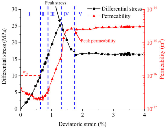 - Initial compaction stage (I). Permeability decreases linearly with increasing axial loading. Internal voids close under compression, so the flow rate decreases due to the shut-down of seepage paths. However, a general permeability decrease is not significant. When the axial differential stress reaches 8.78 MPa, permeability decreases to a minimal level, and the corresponding stress point is defined as σm. It is difficult to observe any gas seepage.