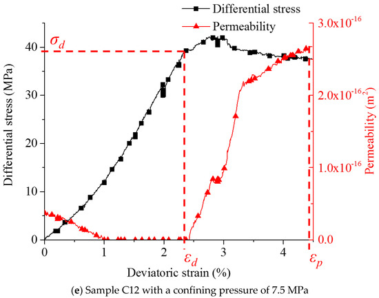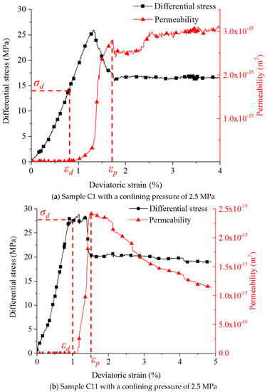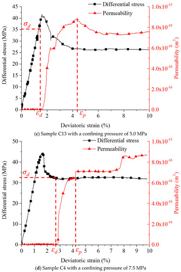 The permeability tends to decrease at a low confining pressure, and the extremely low flow rates at high confining pressure cannot be detected in the early stage due to limits of the measurement devices. The permeability evolution of sample C1 is typical (see Figure 14a). Stress points σd are recorded before peak strength for the confining pressures of 2.5 and 5.0 MPa is reached. With 7.5 MPa confining pressure (samples C4), flow rate is detected for the first time beyond peak differential stress.