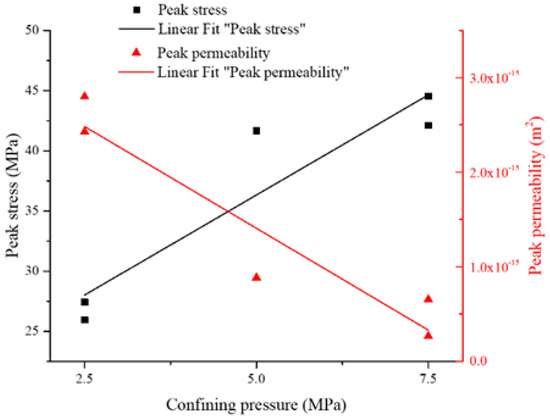 Linear fitting for peak differential stress and peak permeability as function of confining pressure results in Equations (11) and (12), respectively (see Figure 15).