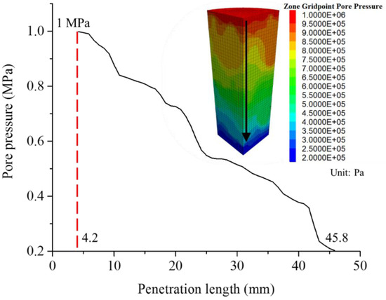 Pore pressure along vertical axis for model C1 (at axial strain of 0.0132, stationary phase) and pore pressure distribution [Pa].