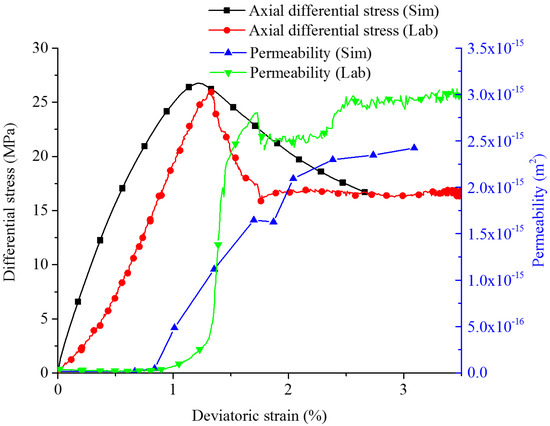 Permeability and strain evolution of coal sample C1 versus differential stress (numerical simulation results).