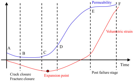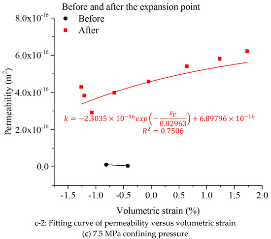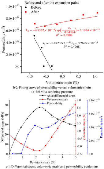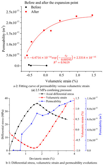 Nonlinear exponential trends for permeability increase with volumetric strain are obtained for the expansion stage (see Equation (14) and Table 5).