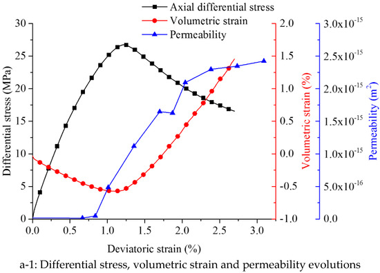 Permeability evolution and complete stress–strain curves for triaxial compression tests.