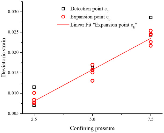 The numerical simulation reveals some consistent characteristics considering that the corresponding deviatoric strain of expansion point is defined as εE. Before the expansion point εE, the permeability k is either constant or slightly increasing. The permeability k shows an exponential behavior with respect to the volumetric strain εV beyond the expansion point εE. Only one exception (sample C4) is observed with a linear trend. The point εE occurs slightly before peak stress is reached. Differential stress and volumetric strain εV show a smooth evolution, but also significant differences when considering different samples. Permeability evolution after the expansion point shows a clear trend, but with remarkable fluctuations. Both εE and εd are strongly related to the confining pressure as shown in Figure 20.
