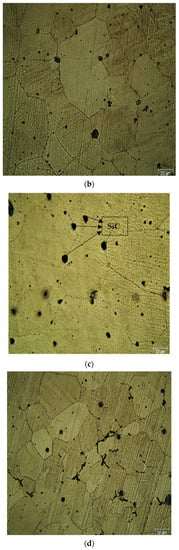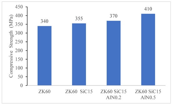 According to the compression results in Figure 11, the compression strength has improved with the reinforcements added to ZK60. The percent increase in compressive strength of ZK60 reinforced with 15% SiC + 0.5% AlN is 20.5% compared to un-reinforced ZK60. The inclusion of reinforcement particles results in an increase in strength since the particles are evenly distributed throughout the main matrix and have a tougher structure. In addition, the increase in the dislocation density of the particles added to the microstructure is also effective in increasing the strength. In addition, nanosized reinforcements have a high dislocation density and prevent the deformation movement of dislocations under stress [].