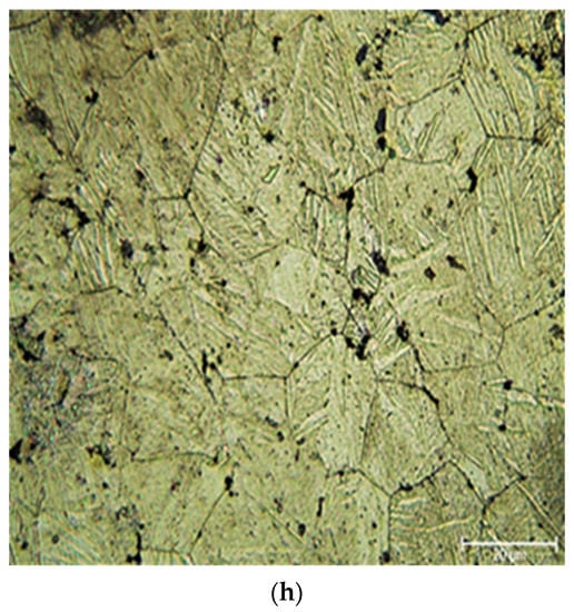 Figure 9 presents the results of the Brinell hardness test for samples of ZK60 that were cast, extruded, and reinforced with SiC and AlN. In comparison, the hardness test results for the ZK60 as cast are 60.23, 73.33 for ZK60 SiC15, 78.29 for SiC15 + AlN0.5, and 81.61 HB for SiC15 + AlN0.5 reinforcements. The hardness value of the unreinforced ZK60, which was 85.65 HB, increased to 96.86 HB by strengthening with SiC15, to 101.23 HB by strengthening with 0.2 percent AlN, and to 103.94 HB by strengthening with 0.5 percent AlN, according to the hardness measurements made after extrusion. The fine-grained structure produced by high deformation of the samples in extrusion also increases the mechanical properties and hardness values of the samples. Additionally, the quantity of added reinforcement raised the hardness in direct proportion to the amount of reinforcement. The addition of tougher particles to the structure, effective solute separation of the AIN particles at the grain boundaries [], and the homogenous dispersion of reinforcement particles by the extrusion deformation process [] are assumed to be the causes of the increase in hardness.