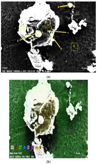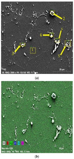 Figure 3a presents the SEM images and Figure 3b stands for the EDX map analysis of the 15%SiC reinforced ZK60 composite at 2k× magnification. Table 3 presents the elemental spectrum response of the selected regions marked with 1–6 in Figure 3a.