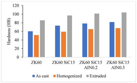 - The hardness test results, respectively, are 60.23, 73.33, 78.29 and 81.61 HB for the as cast unreinforced ZK60, ZK60 SiC15, ZK60 SiC15 AIN0.2 and ZK60 SiC15 AIN0.5. After the extrusion, the hardness values measured as 85.65, 96.86, 101.23 and 103.94 for the ZK60, ZK60 SiC15, ZK60 SiC15 AIN0.2 and ZK60 SiC15 AIN0.5.