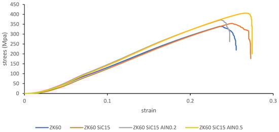Compression test result of the unreinforced ZK60, ZK60 SiC15, ZK60 SiC15 AlN0.2 and the ZK60 SiC15 AlN0.5.