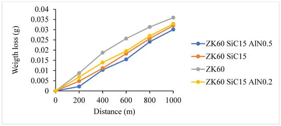 The weight loss of the samples versus sliding distance following the reciprocating wear test performed on the extruded materials under a 20 N load, at a speed of 0.1 mm/s, and over 1000 m is shown in Figure 12. Wear rates are calculated in terms of volume losses per meter. After the 1000 m sliding test the weight loss of the ZK60 is measured as 0.0359 g. The weight loss of the ZK60 +15% SiC reinforced composite is 0.03287, and the one of the ZK60 +15% SiC +0.2% AlN reinforced composite is 0.03203, and lastly for ZK60 +15% SiC + 0.5% AlN it is 0.0301 g. Thus, the reinforcement elements have increased the wear resistance concerning the amount of the addition.