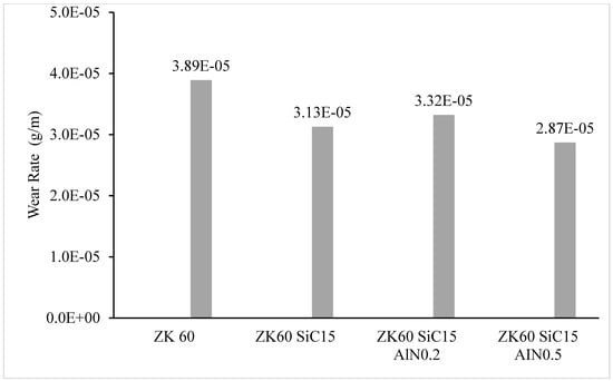 The wear rates (g/m) calculated from Figure 12 are shown in Figure 13. Under 20 N load, the wear rates of ZK60, ZK60 SiC15, ZK60 SiC15 AlN0.2 and ZK60 SiC15 AlN0.5, were measured as 3.89 × 10−5, 3.13 × 10−5, 3.32 × 10−5, and 2.87 × 10−5 g/m, respectively.