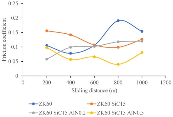 Figure 14 presents the comparisons of the change of the friction coefficient depending on the sliding distance. The average friction coefficients of the samples, respectively, are 0.1268, 0.1262, 0.0994, and 0.0684 for ZK60 alloy, and ZK60 SiC15, ZK60 SiC15 AlN0.2, and ZK60 SiC15 AlN0.5 composites.
