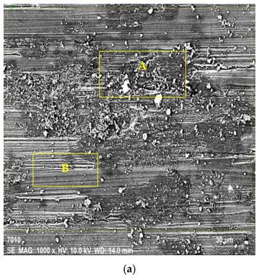 The SEM images taken from the surfaces of the worn samples are shown in Figure 15 and Figure 16. Figure 15a presents the SEM images of the extruded ZK60 alloy at 1k× and Figure 15b presents the general elemental spectrum response graph of the unreinforced ZK60. On the SEM images, the adhesive and abrasive wear mechanisms are labeled A and B in Figure 15a, respectively. The adhesion wear mechanism (A) is enriched in Mg, Zn, and a trace quantity of Fe and Cr elements from the counter surface and other alloying elements given in Table 5.