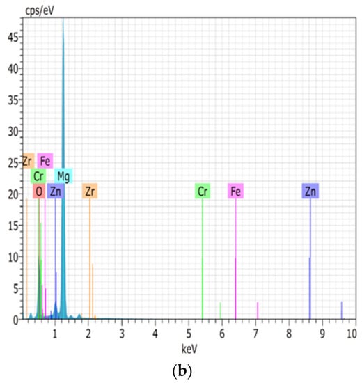 As listed in Table 3, the presence of 4.48% C, 87.15% Mg, 8.45% Zn elements in the region 1 of Figure 3a indicates the main matrix. The region shown by 2 and in Figure 3a contains 13.22% C and 36.19% Si proving the structure of SiC particles in the composite. Moreover, at the grain boundaries of the SiC particle there is some amount of Zr. As well, with a spectrum of 11.9% C, 29.59% Si, and 55.6% Mg elements the region 3 depicts the SiC particle and similarly the region 4 stands for the SiC particle. The region 5 indicates the existence of Mg2 Zn intermetallic and region 6 indicates some small amount of fine grained SiC particles. In the powder mixing the while using V type mixer some SiC particles are naturally fined by steel balls in the mixer.