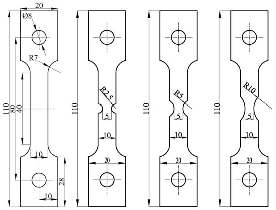 Specimens with different notch radii were designed to determine the relationships between different stress triaxialities and fracture strains, as shown in Figure 1.