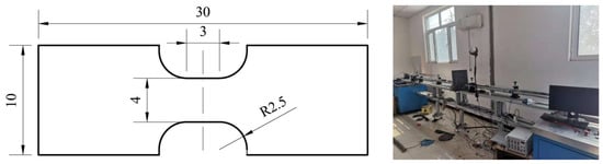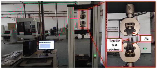 At room temperature, the quasi-static tensile test was carried out on a YSH-229WJ-10T microcomputer-controlled electronic universal material testing machine (Jinan Wance Electrical Equipment Co. Ltd, Jinan, China). The specimen mounting is shown in Figure 2. The test standard was based on ASTM E8 “Experimental method for tensile test of metal materials”. First, the specimen was preloaded with a failure load of no more than 30% of the expected failure load, and the tensile test was carried out after ensuring that no abnormalities were present. The quasi-static tensile load was applied to the specimen at different strain rates until the specimen was destroyed or the load decreased by 40% from the maximum value. The loading was stopped, and the maximum load and failure mode were recorded. Each group of experiments was carried out three times, and the average values were selected as the final data.
