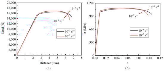 The load–displacement curve and the engineering stress–strain curve obtained from the quasi-static tensile test are shown in Figure 4.