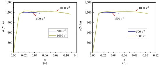 The stress–strain curve obtained from the dynamic tensile test is shown in Figure 5a. Due to the oscillation of high-strain experimental data, the data were smoothed to facilitate the estimation of the material parameters, as shown in Figure 5b.