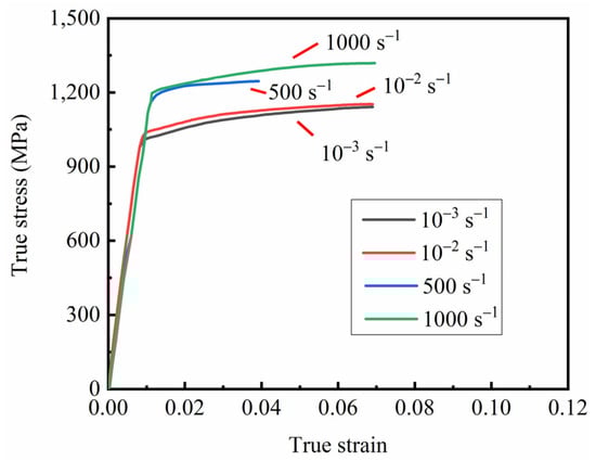 The experimental curve shows that the strain rate has no obvious effect on the flow stress at room temperature. Under the condition of constant volume, the engineering stress–strain curve of the material has the following relationship with the real stress–strain curve: