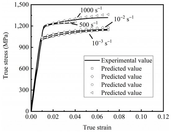 The comparison between the rheological stress predicted by the Johnson–Cook model at different strain rates and the experimental data is shown in Figure 7. The predicted values of the Johnson–Cook constitutive model provide a good fit for the experimental values. A reliable material constitutive equation was provided for the subsequent finite element simulations.