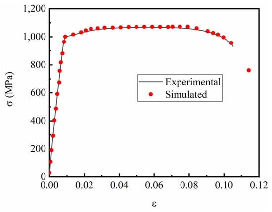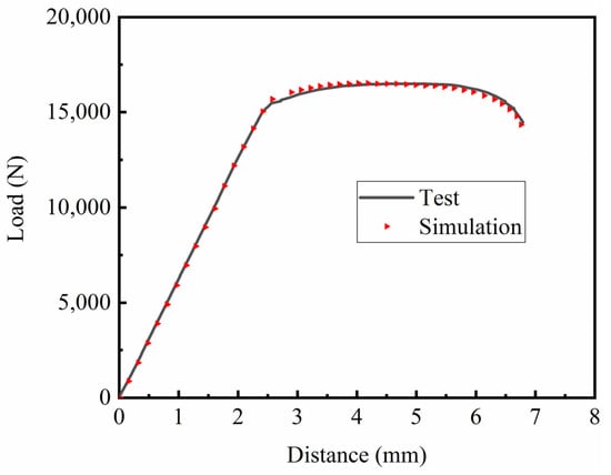 The fitting parameters of the TC4 titanium alloy’s elastic–plastic model were input into ABAQUS software 2020 for simulation calculations. The simulated strain rate was 10−3 s−1, and the load–displacement curve of the smooth specimen was obtained. The accuracy of the fitting parameters was determined by comparing the simulated load–displacement curve with the test load–displacement curve, as shown in Figure 8.