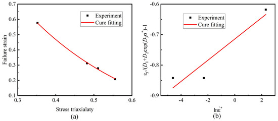 Johnson–Cook fracture model fitting curves: (a) fitting parameters D1–D3; (b) fitting parameter D4.