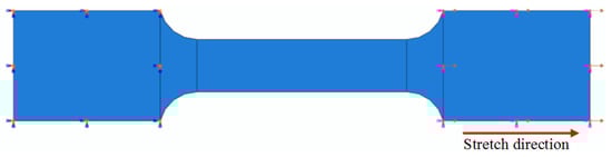 By using the established Johnson–Cook constitutive model and fracture failure model, the finite element software ABAQUS was used to recalculate all of the samples, and the ABAQUS calculation results were compared with the test results to verify the accuracy of the failure model. The boundary conditions of the model are shown in Figure 10. The boundary conditions of the sample were applied in accordance with the test loading direction, and the simulated strain rate was consistent with the test strain rate, which was the reference strain rate. The left end of the model was fully constrained, and the right end was free in the tensile direction, applying the same tensile speed as the test to ensure a consistent strain rate.